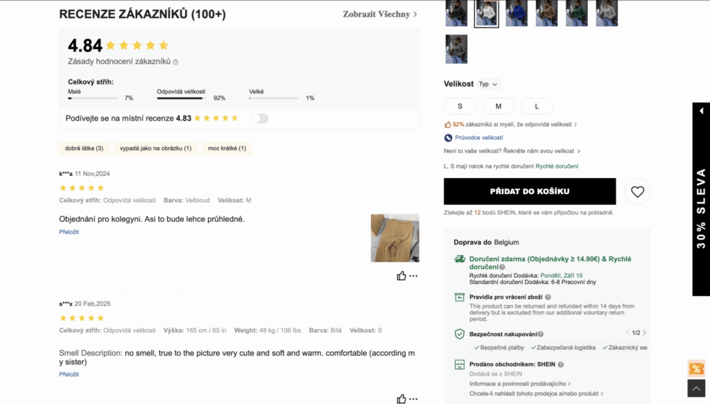Recenze Shein uvádějí přibližně 85% spokojenost s rychlostí doručení a kvalitou základního sortimentu.
