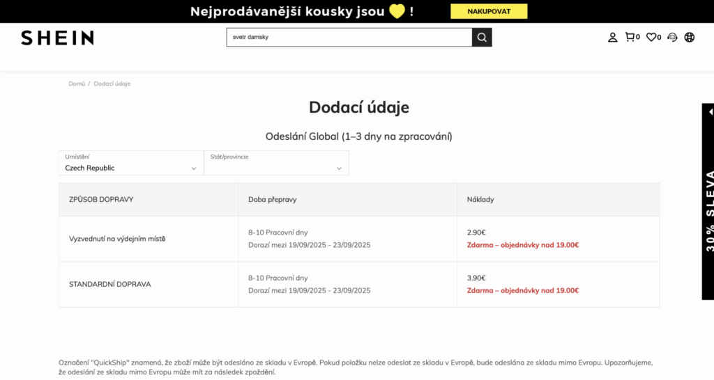 Shein doba dodání závisí na vybrané variantě přepravy a aktuální vytíženosti logistických center. Standardní možnosti zahrnují několik kategorií podle rychlosti a ceny.