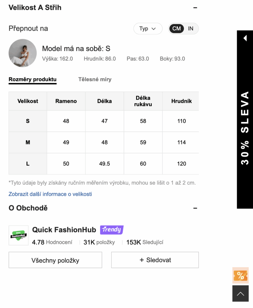 Každý produkt obsahuje detailní velikostní tabulku s rozměry v centimetrech. Základní měření zahrnují: