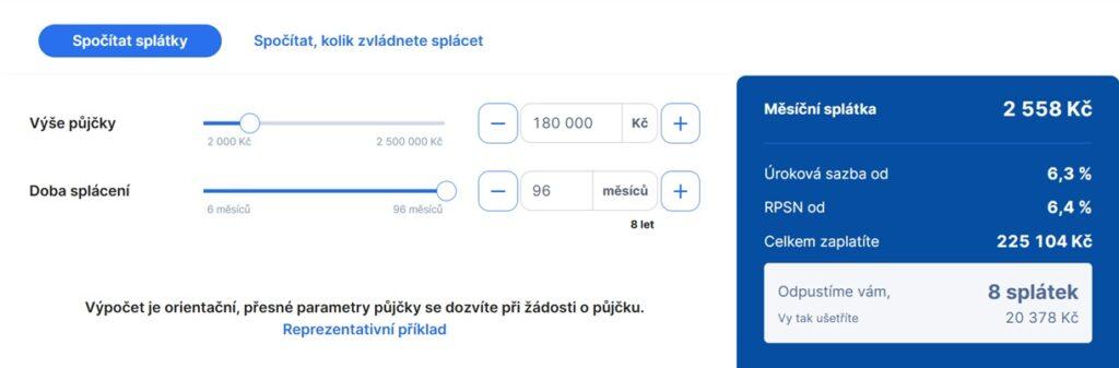 Úvěr ve výši 400 000 Kč se splatností 108 měsíců a úrokovou sazbou 6,4 % ročně má měsíční splátku 4 857 Kč. RPSN je 6,4 % a celková částka splatná spotřebitelem 524 481 Kč. Díky řádnému splácení bude u tohoto úvěru počet odpuštěných splátek 10, doba splácení 98 měsíců, úroková sazba 4,4 % ročně, RPSN 4,4 % a celková částka splatná spotřebitelem 475 986 Kč.