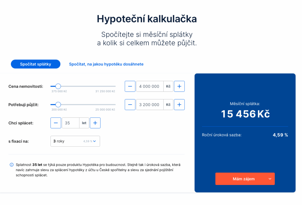 - úroková sazba (aktuálně 4,14–5,59 % p.a. pro hypotéky)