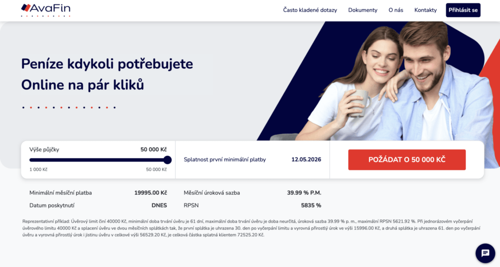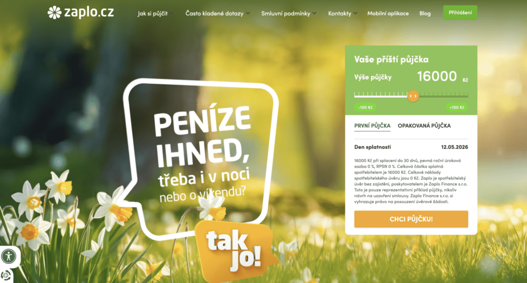 Tento poskytovatel cílí na krátkodobé překlenutí finančního výpadku. Noví klienti mohou první půjčku získat zdarma, u placených variant je však nutné počítat s vysokým zatížením. Příklad půjčky 1 000 Kč na 30 dní představuje poplatek 375 Kč, což znamená celkovou splatnou částku 1 375 Kč a RPSN 4 716 %.