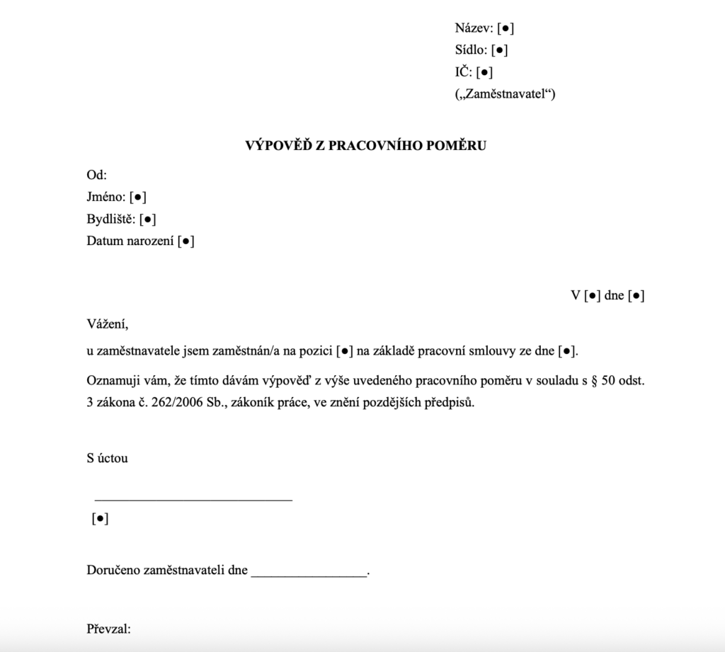 Zaměstnanec může podat vzor výpovědi z práce bez udání důvodu – zákon mu tuto svobodu přiznává. Oproti tomu ukončení pracovního poměru ze strany zaměstnavatele je možné pouze z důvodů výslovně vyjmenovaných v § 52 zákoníku práce.