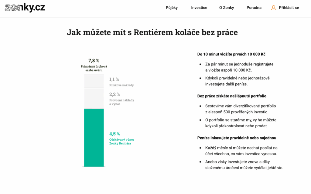 Zonky rentiér může dosáhnout výnosů 3-7 % ročně podle zvolené strategie a rizikového profilu.
